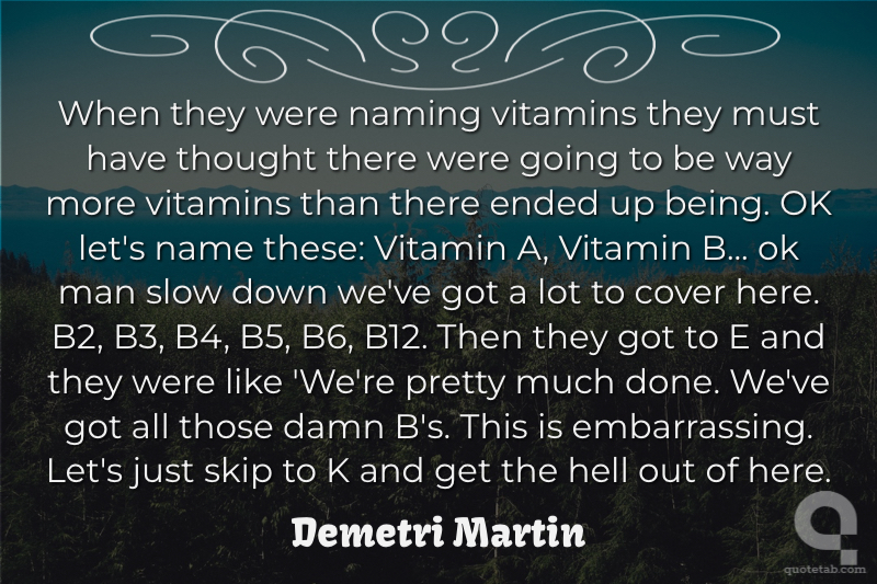 When they were naming vitamins they must have thought there were going to be way more vitamins than there ended up being. OK let's name these: Vitamin A, Vitamin B... ok man slow down we've got a lot to cover here. B2, B3, B4, B5, B6, B12. Then they got to E and they were like 'We're pretty much done. We've got all those damn B's. This is embarrassing. Let's just skip to K and get the hell out of here.