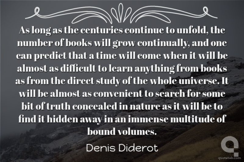 As long as the centuries continue to unfold, the number of books will grow continually, and one can predict that a time will come when it will be almost as difficult to learn anything from books as from the direct study of the whole universe. It will be almost as convenient to search for some bit of truth concealed in nature as it will be to find it hidden away in an immense multitude of bound volumes.