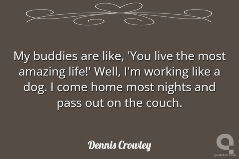 My buddies are like, 'You live the most amazing life!' Well, I'm working like a dog. I come home most nights and pass out on the couch.