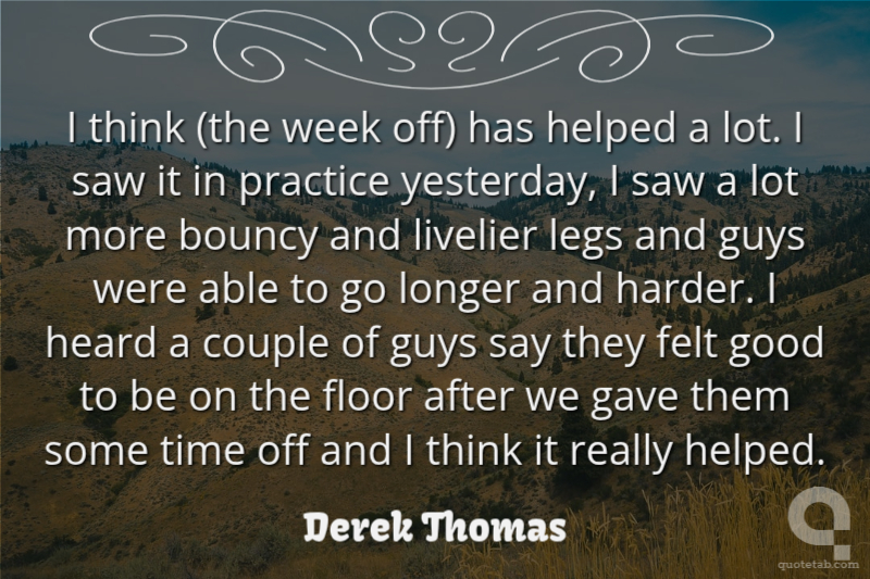 I think (the week off) has helped a lot. I saw it in practice yesterday, I saw a lot more bouncy and livelier legs and guys were able to go longer and harder. I heard a couple of guys say they felt good to be on the floor after we gave them some time off and I think it really helped.