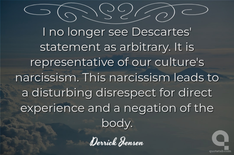 I no longer see Descartes' statement as arbitrary. It is representative of our culture's narcissism. This narcissism leads to a disturbing disrespect for direct experience and a negation of the body.