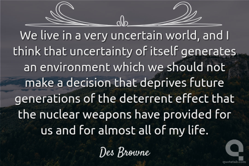 We live in a very uncertain world, and I think that uncertainty of itself generates an environment which we should not make a decision that deprives future generations of the deterrent effect that the nuclear weapons have provided for us and for almost all of my life.