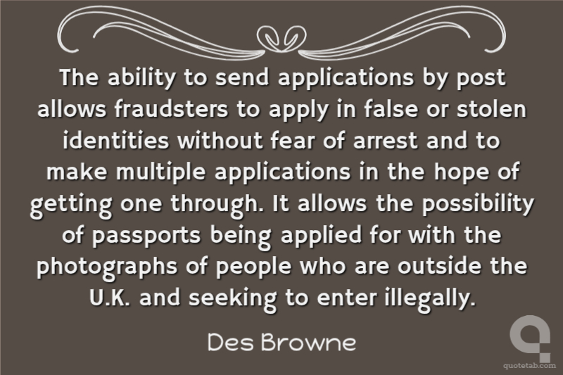 The ability to send applications by post allows fraudsters to apply in false or stolen identities without fear of arrest and to make multiple applications in the hope of getting one through. It allows the possibility of passports being applied for with the photographs of people who are outside the U.K. and seeking to enter illegally.