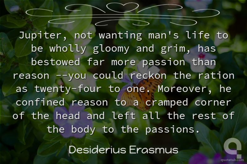 Jupiter, not wanting man's life to be wholly gloomy and grim, has bestowed far more passion than reason --you could reckon the ration as twenty-four to one. Moreover, he confined reason to a cramped corner of the head and left all the rest of the body to the passions.