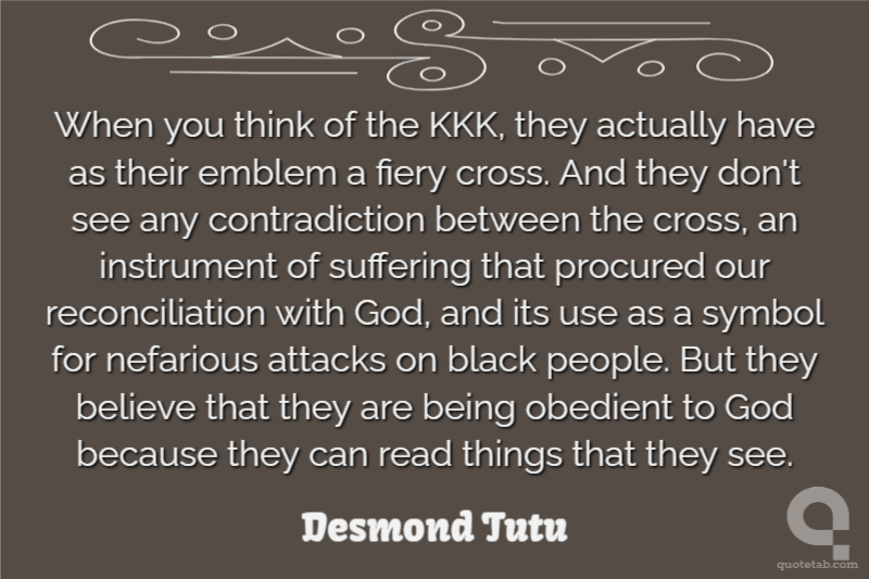 When you think of the KKK, they actually have as their emblem a fiery cross. And they don't see any contradiction between the cross, an instrument of suffering that procured our reconciliation with God, and its use as a symbol for nefarious attacks on black people. But they believe that they are being obedient to God because they can read things that they see.