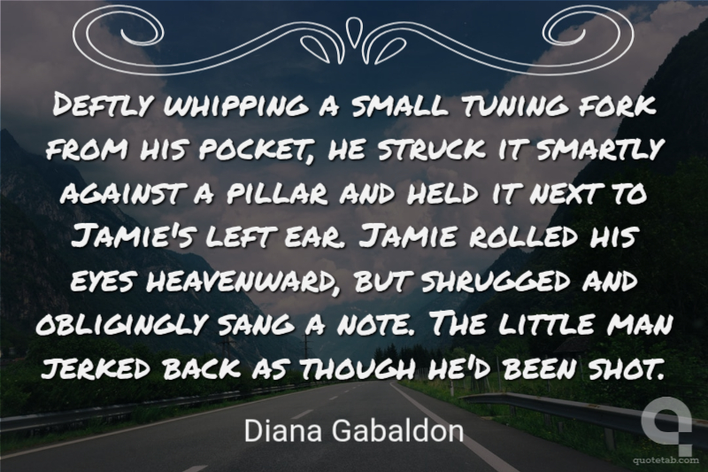 Deftly whipping a small tuning fork from his pocket, he struck it smartly against a pillar and held it next to Jamie's left ear. Jamie rolled his eyes heavenward, but shrugged and obligingly sang a note. The little man jerked back as though he'd been shot.