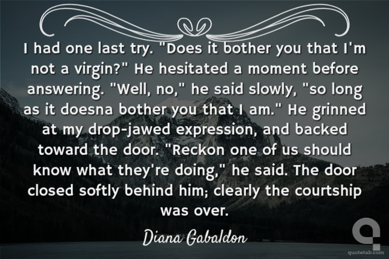 I had one last try. "Does it bother you that I'm not a virgin?" He hesitated a moment before answering. "Well, no," he said slowly, "so long as it doesna bother you that I am." He grinned at my drop-jawed expression, and backed toward the door. "Reckon one of us should know what they're doing," he said. The door closed softly behind him; clearly the courtship was over.