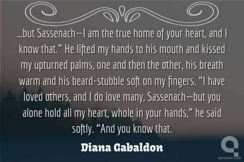 …but Sassenach—I am the true home of your heart, and I know that.” He lifted my hands to his mouth and kissed my upturned palms, one and then the other, his breath warm and his beard-stubble soft on my fingers. “I have loved others, and I do love many, Sassenach—but you alone hold all my heart, whole in your hands,” he said softly. “And you know that.