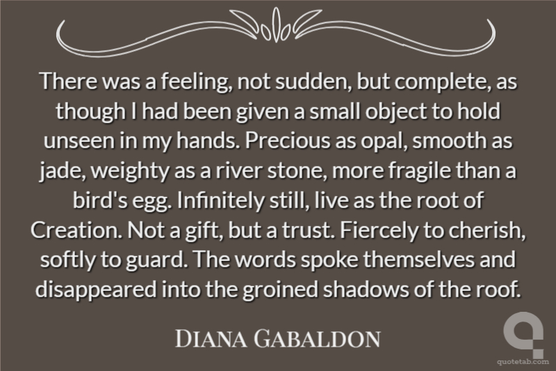 There was a feeling, not sudden, but complete, as though I had been given a small object to hold unseen in my hands. Precious as opal, smooth as jade, weighty as a river stone, more fragile than a bird's egg. Infinitely still, live as the root of Creation. Not a gift, but a trust. Fiercely to cherish, softly to guard. The words spoke themselves and disappeared into the groined shadows of the roof.