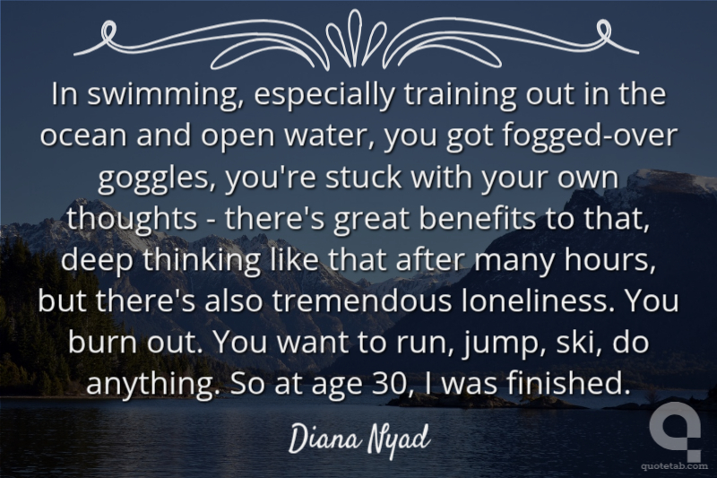 In swimming, especially training out in the ocean and open water, you got fogged-over goggles, you're stuck with your own thoughts - there's great benefits to that, deep thinking like that after many hours, but there's also tremendous loneliness. You burn out. You want to run, jump, ski, do anything. So at age 30, I was finished.