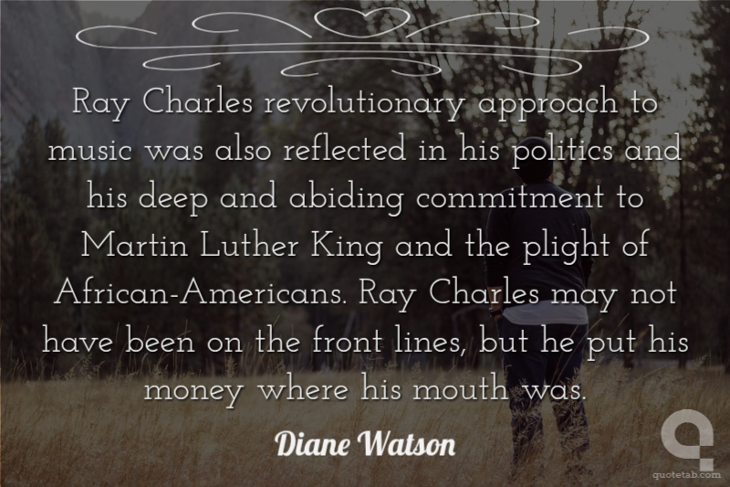 Ray Charles revolutionary approach to music was also reflected in his politics and his deep and abiding commitment to Martin Luther King and the plight of African-Americans. Ray Charles may not have been on the front lines, but he put his money where his mouth was.