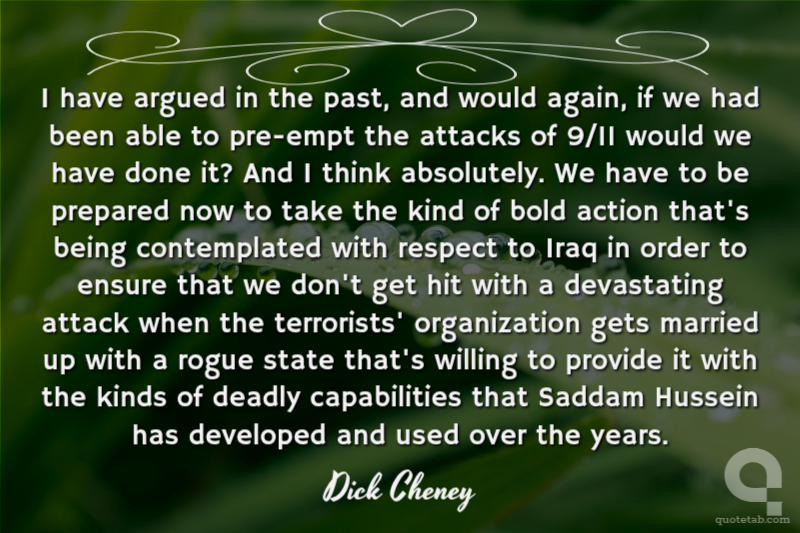 I have argued in the past, and would again, if we had been able to pre-empt the attacks of 9/11 would we have done it? And I think absolutely. We have to be prepared now to take the kind of bold action that's being contemplated with respect to Iraq in order to ensure that we don't get hit with a devastating attack when the terrorists' organization gets married up with a rogue state that's willing to provide it with the kinds of deadly capabilities that Saddam Hussein has developed and used over the years.
