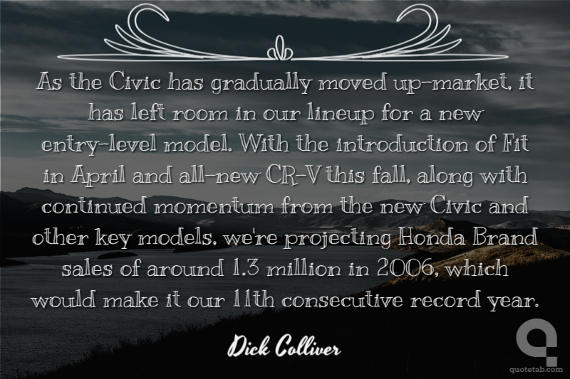 As the Civic has gradually moved up-market, it has left room in our lineup for a new entry-level model. With the introduction of Fit in April and all-new CR-V this fall, along with continued momentum from the new Civic and other key models, we're projecting Honda Brand sales of around 1.3 million in 2006, which would make it our 11th consecutive record year.
