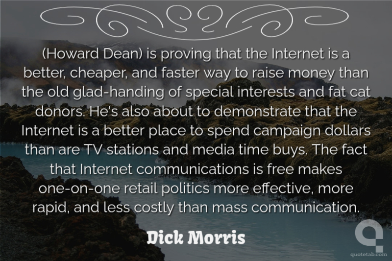 (Howard Dean) is proving that the Internet is a better, cheaper, and faster way to raise money than the old glad-handing of special interests and fat cat donors. He's also about to demonstrate that the Internet is a better place to spend campaign dollars than are TV stations and media time buys. The fact that Internet communications is free makes one-on-one retail politics more effective, more rapid, and less costly than mass communication.