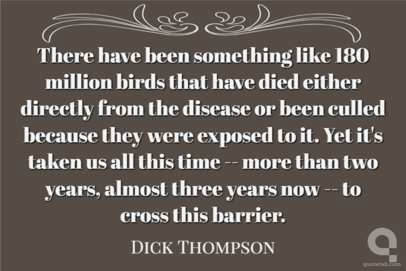 There have been something like 180 million birds that have died either directly from the disease or been culled because they were exposed to it. Yet it's taken us all this time -- more than two years, almost three years now -- to cross this barrier.