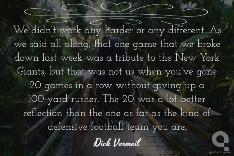 We didn't work any harder or any different. As we said all along, that one game that we broke down last week was a tribute to the New York Giants, but that was not us when you've gone 20 games in a row without giving up a 100-yard rusher. The 20 was a lot better reflection than the one as far as the kind of defensive football team you are.