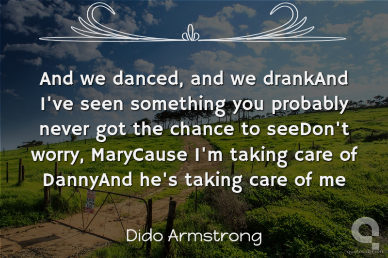 And we danced, and we drankAnd I've seen something you probably never got the chance to seeDon't worry, MaryCause I'm taking care of DannyAnd he's taking care of me