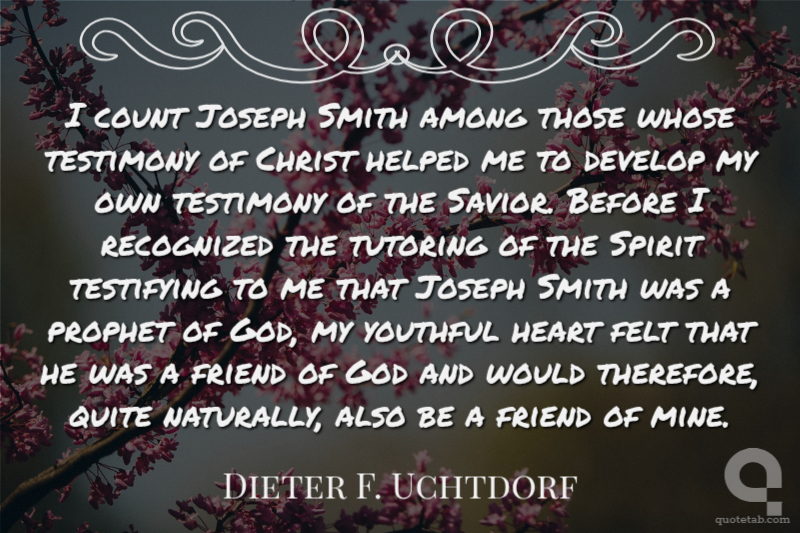 I count Joseph Smith among those whose testimony of Christ helped me to develop my own testimony of the Savior. Before I recognized the tutoring of the Spirit testifying to me that Joseph Smith was a prophet of God, my youthful heart felt that he was a friend of God and would therefore, quite naturally, also be a friend of mine.