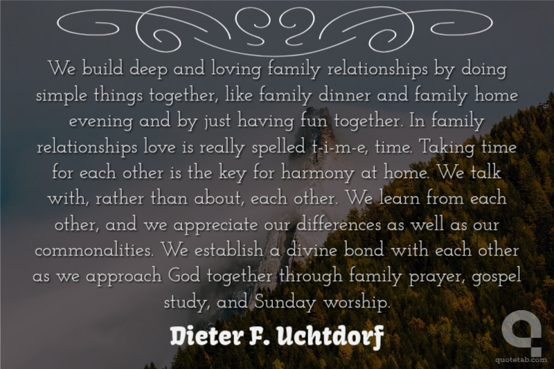We build deep and loving family relationships by doing simple things together, like family dinner and family home evening and by just having fun together. In family relationships love is really spelled t-i-m-e, time. Taking time for each other is the key for harmony at home. We talk with, rather than about, each other. We learn from each other, and we appreciate our differences as well as our commonalities. We establish a divine bond with each other as we approach God together through family prayer, gospel study, and Sunday worship.