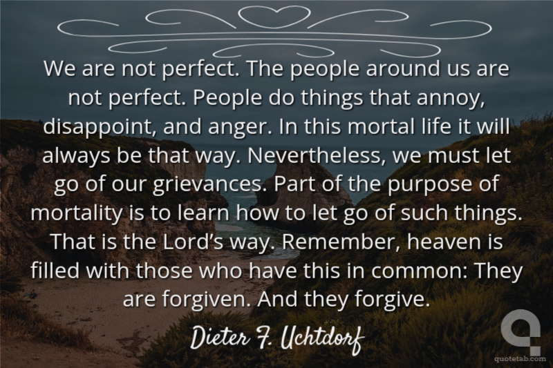 We are not perfect. The people around us are not perfect. People do things that annoy, disappoint, and anger. In this mortal life it will always be that way. Nevertheless, we must let go of our grievances. Part of the purpose of mortality is to learn how to let go of such things. That is the Lord’s way. Remember, heaven is filled with those who have this in common: They are forgiven. And they forgive.