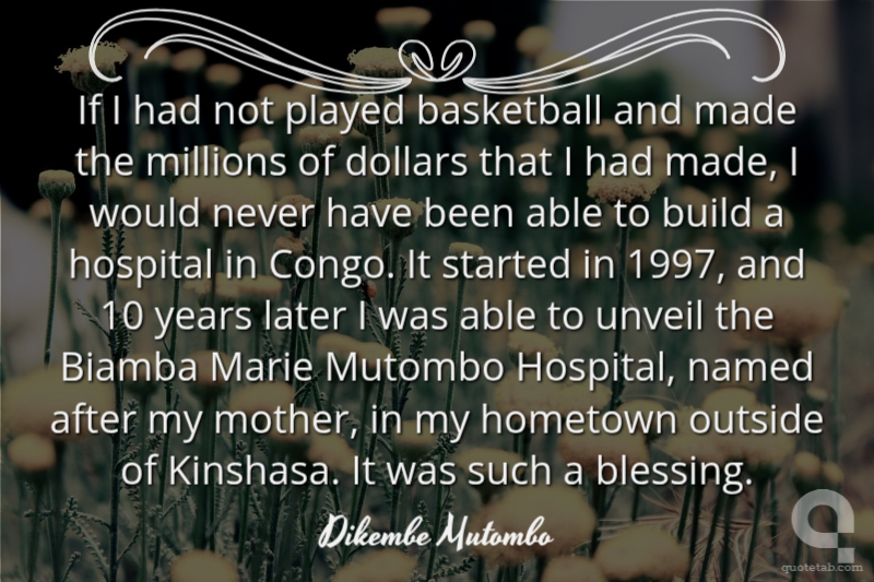 If I had not played basketball and made the millions of dollars that I had made, I would never have been able to build a hospital in Congo. It started in 1997, and 10 years later I was able to unveil the Biamba Marie Mutombo Hospital, named after my mother, in my hometown outside of Kinshasa. It was such a blessing.