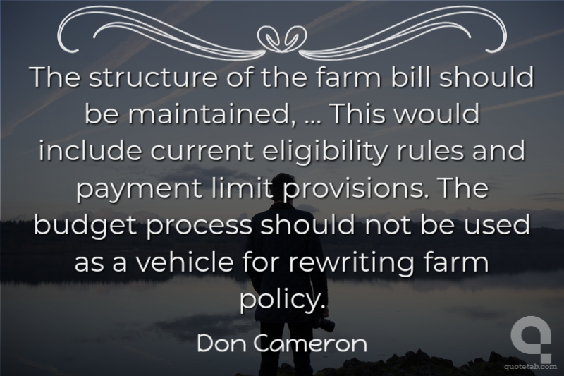 The structure of the farm bill should be maintained, ... This would include current eligibility rules and payment limit provisions. The budget process should not be used as a vehicle for rewriting farm policy.