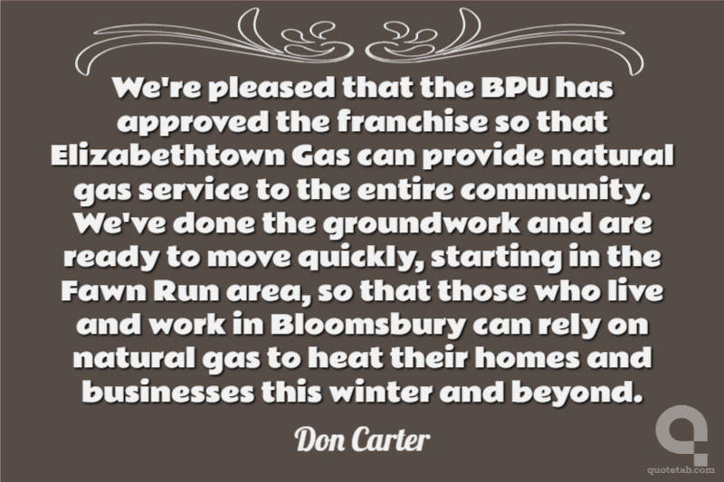 We're pleased that the BPU has approved the franchise so that Elizabethtown Gas can provide natural gas service to the entire community. We've done the groundwork and are ready to move quickly, starting in the Fawn Run area, so that those who live and work in Bloomsbury can rely on natural gas to heat their homes and businesses this winter and beyond.