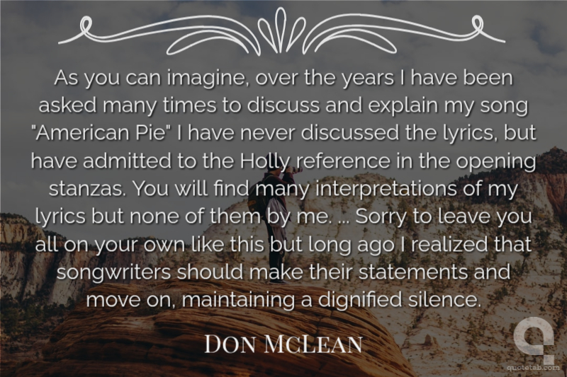 As you can imagine, over the years I have been asked many times to discuss and explain my song "American Pie" I have never discussed the lyrics, but have admitted to the Holly reference in the opening stanzas. You will find many interpretations of my lyrics but none of them by me. ... Sorry to leave you all on your own like this but long ago I realized that songwriters should make their statements and move on, maintaining a dignified silence.