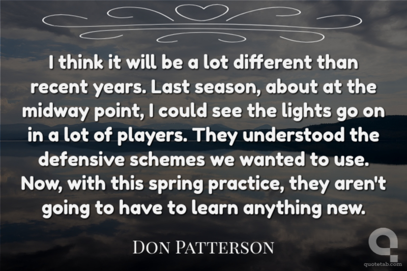 I think it will be a lot different than recent years. Last season, about at the midway point, I could see the lights go on in a lot of players. They understood the defensive schemes we wanted to use. Now, with this spring practice, they aren't going to have to learn anything new.
