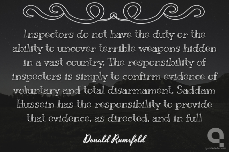 Inspectors do not have the duty or the ability to uncover terrible weapons hidden in a vast country. The responsibility of inspectors is simply to confirm evidence of voluntary and total disarmament. Saddam Hussein has the responsibility to provide that evidence, as directed, and in full