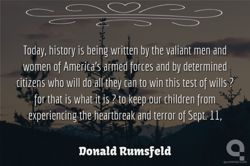 Today, history is being written by the valiant men and women of America's armed forces and by determined citizens who will do all they can to win this test of wills ? for that is what it is ? to keep our children from experiencing the heartbreak and terror of Sept. 11,