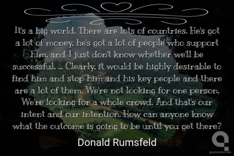 It's a big world. There are lots of countries. He's got a lot of money, he's got a lot of people who support him, and I just don't know whether we'll be successful, ... Clearly, it would be highly desirable to find him and stop him and his key people and there are a lot of them. We're not looking for one person. We're looking for a whole crowd. And that's our intent and our intention. How can anyone know what the outcome is going to be until you get there?