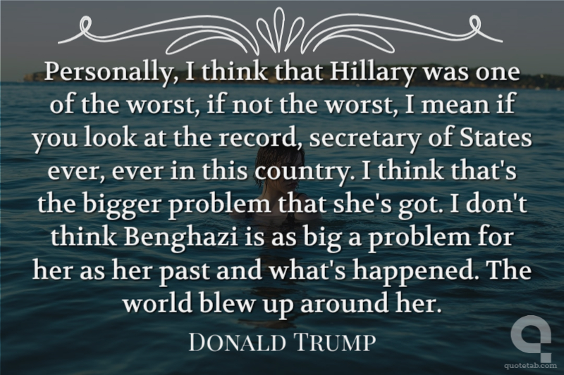 Personally, I think that Hillary was one of the worst, if not the worst, I mean if you look at the record, secretary of States ever, ever in this country. I think that's the bigger problem that she's got. I don't think Benghazi is as big a problem for her as her past and what's happened. The world blew up around her.