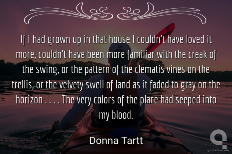 If I had grown up in that house I couldn't have loved it more, couldn't have been more familiar with the creak of the swing, or the pattern of the clematis vines on the trellis, or the velvety swell of land as it faded to gray on the horizon . . . . The very colors of the place had seeped into my blood.