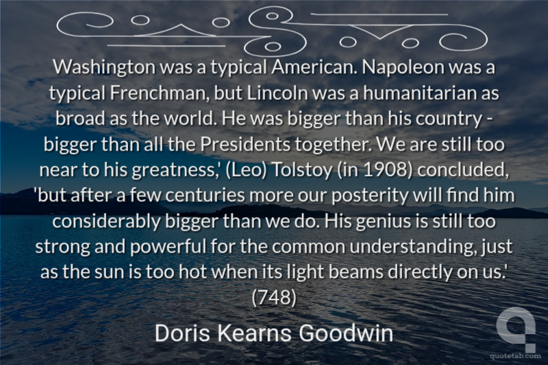 Washington was a typical American. Napoleon was a typical Frenchman, but Lincoln was a humanitarian as broad as the world. He was bigger than his country - bigger than all the Presidents together. We are still too near to his greatness,' (Leo) Tolstoy (in 1908) concluded, 'but after a few centuries more our posterity will find him considerably bigger than we do. His genius is still too strong and powerful for the common understanding, just as the sun is too hot when its light beams directly on us.' (748)