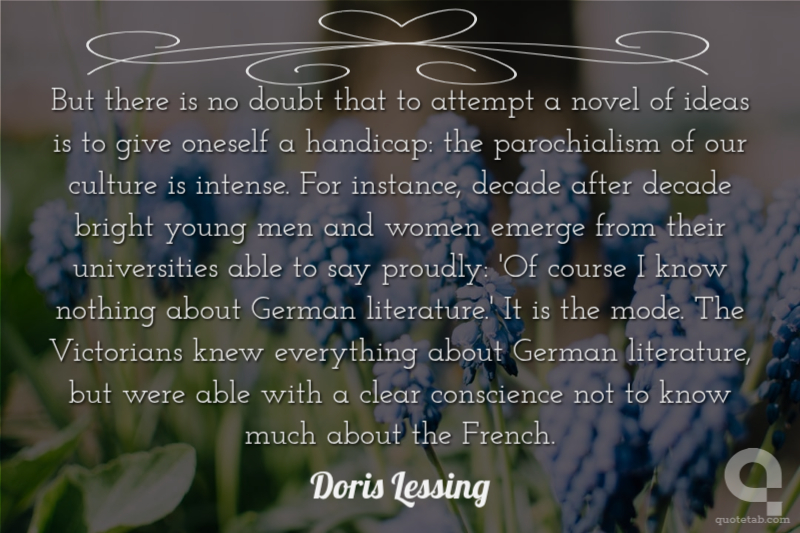 But there is no doubt that to attempt a novel of ideas is to give oneself a handicap: the parochialism of our culture is intense. For instance, decade after decade bright young men and women emerge from their universities able to say proudly: 'Of course I know nothing about German literature.' It is the mode. The Victorians knew everything about German literature, but were able with a clear conscience not to know much about the French.