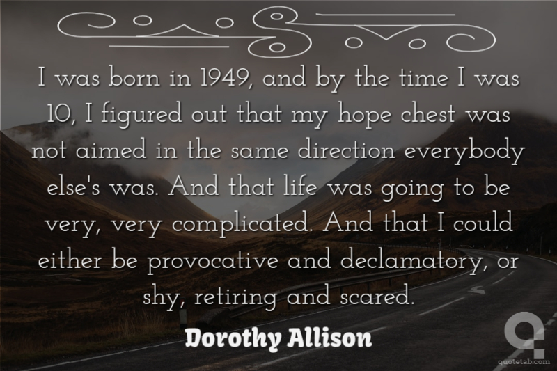 I was born in 1949, and by the time I was 10, I figured out that my hope chest was not aimed in the same direction everybody else's was. And that life was going to be very, very complicated. And that I could either be provocative and declamatory, or shy, retiring and scared.