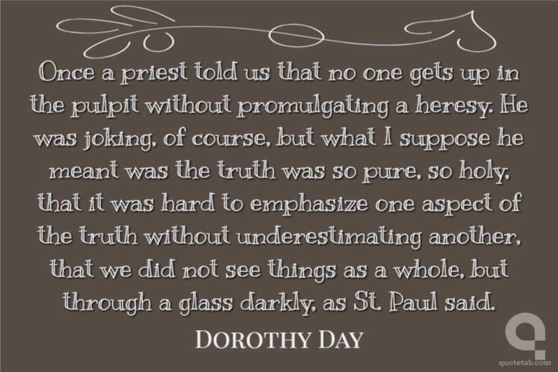 Once a priest told us that no one gets up in the pulpit without promulgating a heresy. He was joking, of course, but what I suppose he meant was the truth was so pure, so holy, that it was hard to emphasize one aspect of the truth without underestimating another, that we did not see things as a whole, but through a glass darkly, as St. Paul said.