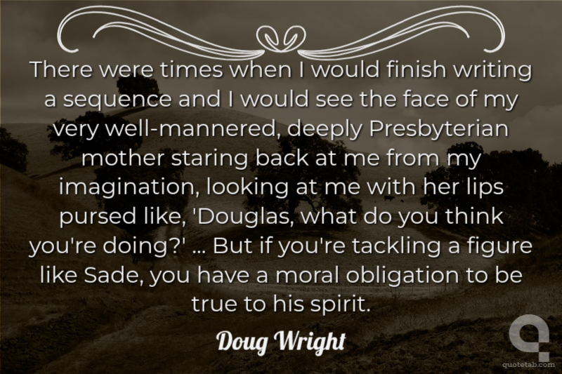 There were times when I would finish writing a sequence and I would see the face of my very well-mannered, deeply Presbyterian mother staring back at me from my imagination, looking at me with her lips pursed like, 'Douglas, what do you think you're doing?' ... But if you're tackling a figure like Sade, you have a moral obligation to be true to his spirit.