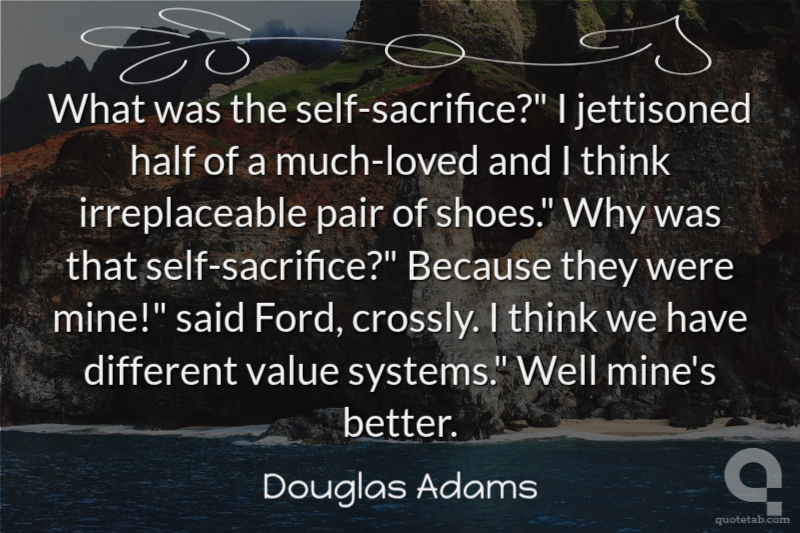 What was the self-sacrifice?" I jettisoned half of a much-loved and I think irreplaceable pair of shoes." Why was that self-sacrifice?" Because they were mine!" said Ford, crossly. I think we have different value systems." Well mine's better.