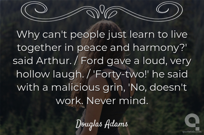 Why can't people just learn to live together in peace and harmony?' said Arthur. / Ford gave a loud, very hollow laugh. / 'Forty-two!' he said with a malicious grin, 'No, doesn't work. Never mind.