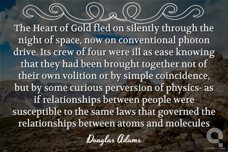 The Heart of Gold fled on silently through the night of space, now on conventional photon drive. Its crew of four were ill as ease knowing that they had been brought together not of their own volition or by simple coincidence, but by some curious perversion of physics- as if relationships between people were susceptible to the same laws that governed the relationships between atoms and molecules