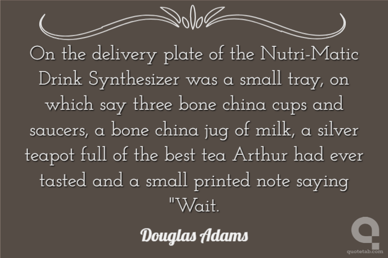 On the delivery plate of the Nutri-Matic Drink Synthesizer was a small tray, on which say three bone china cups and saucers, a bone china jug of milk, a silver teapot full of the best tea Arthur had ever tasted and a small printed note saying "Wait.