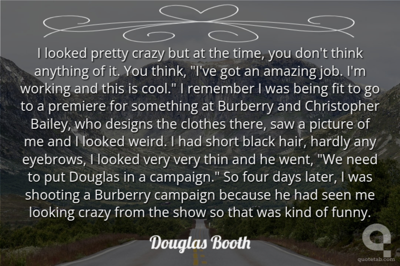 I looked pretty crazy but at the time, you don't think anything of it. You think, "I've got an amazing job. I'm working and this is cool." I remember I was being fit to go to a premiere for something at Burberry and Christopher Bailey, who designs the clothes there, saw a picture of me and I looked weird. I had short black hair, hardly any eyebrows, I looked very very thin and he went, "We need to put Douglas in a campaign." So four days later, I was shooting a Burberry campaign because he had seen me looking crazy from the show so that was kind of funny.