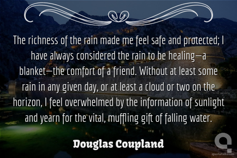 The richness of the rain made me feel safe and protected; I have always considered the rain to be healing—a blanket—the comfort of a friend. Without at least some rain in any given day, or at least a cloud or two on the horizon, I feel overwhelmed by the information of sunlight and yearn for the vital, muffling gift of falling water.