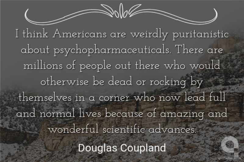 I think Americans are weirdly puritanistic about psychopharmaceuticals. There are millions of people out there who would otherwise be dead or rocking by themselves in a corner who now lead full and normal lives because of amazing and wonderful scientific advances.