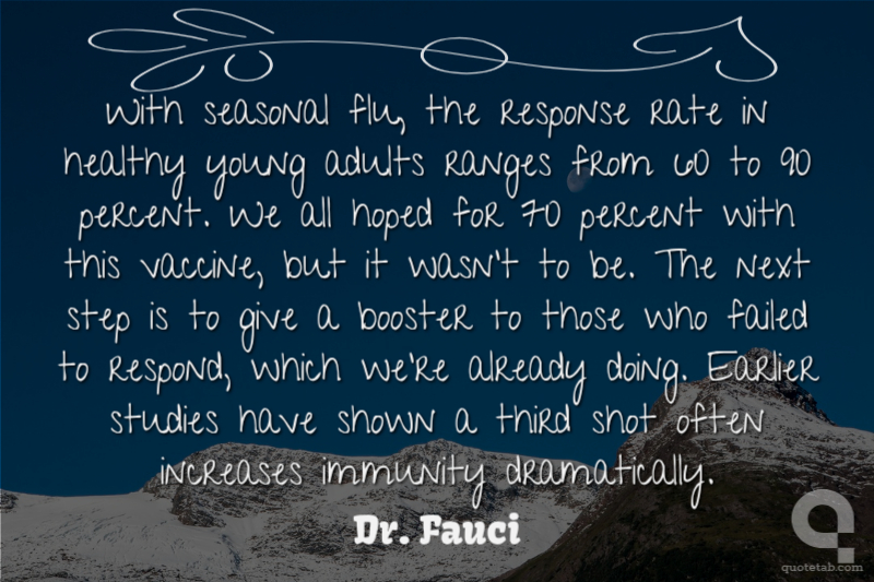 With seasonal flu, the response rate in healthy young adults ranges from 60 to 90 percent. We all hoped for 70 percent with this vaccine, but it wasn't to be. The next step is to give a booster to those who failed to respond, which we're already doing. Earlier studies have shown a third shot often increases immunity dramatically.