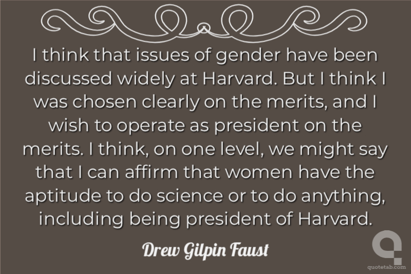 I think that issues of gender have been discussed widely at Harvard. But I think I was chosen clearly on the merits, and I wish to operate as president on the merits. I think, on one level, we might say that I can affirm that women have the aptitude to do science or to do anything, including being president of Harvard.