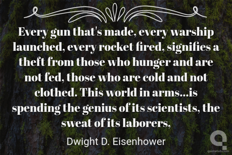 Every gun that's made, every warship launched, every rocket fired, signifies a theft from those who hunger and are not fed, those who are cold and not clothed. This world in arms...is spending the genius of its scientists, the sweat of its laborers,