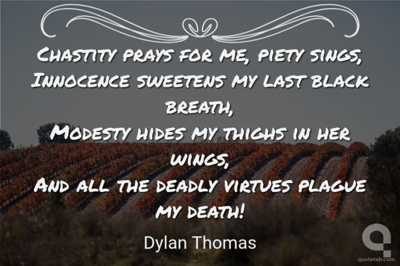 Chastity prays for me, piety sings, Innocence sweetens my last black breath, Modesty hides my thighs in her wings, And all the deadly virtues plague my death!